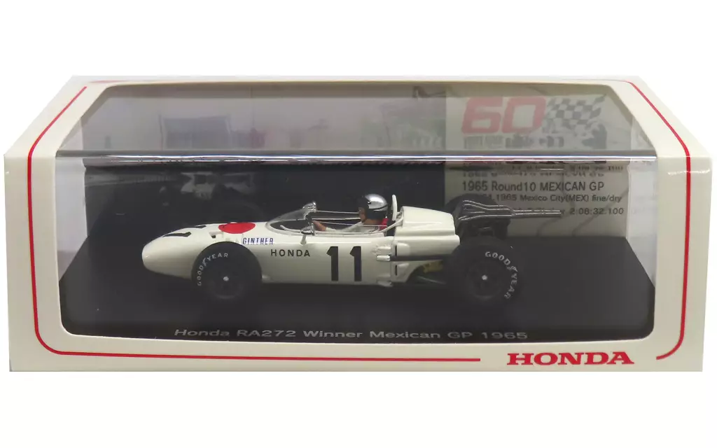 商品解説■Honda RA272 Winner Mexican GP 1965 #11(ホワイト)が、1/43スケールのディスプレイモデルで登場です。車名が刻まれた専用台座とともにクリアケースに封入されています。【商品詳細】サイズ:全長約9.5cmドライバー:Richie Ginther