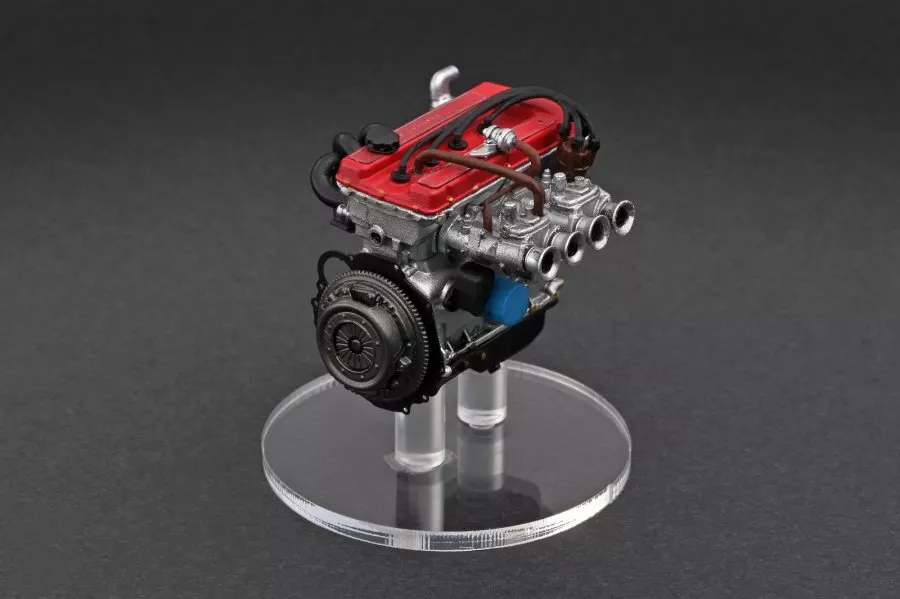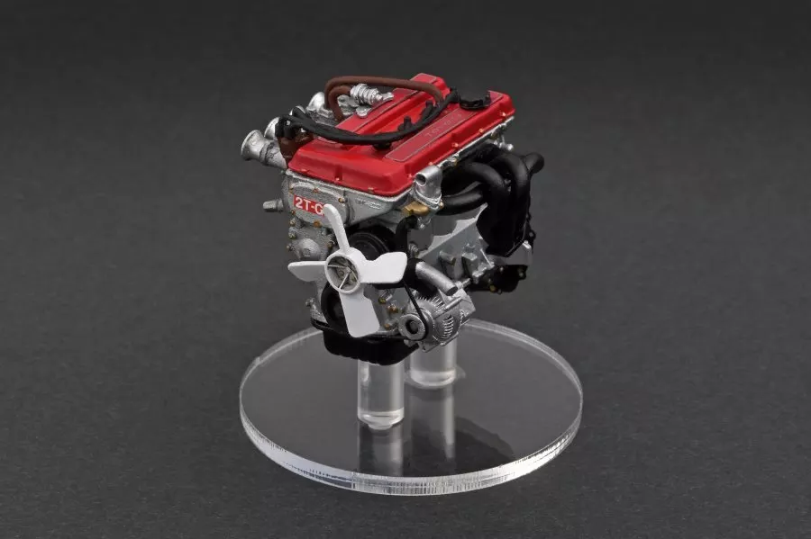 製品には同スケールの「2T-G エンジン」を付属。1600cc 直列 4 気筒 DOHC エンジンにソレックス製ツインキャブレターを装着。レッドのヘッドカバーが誇らしげな「2T-G エンジン」を詳細に再現しました。