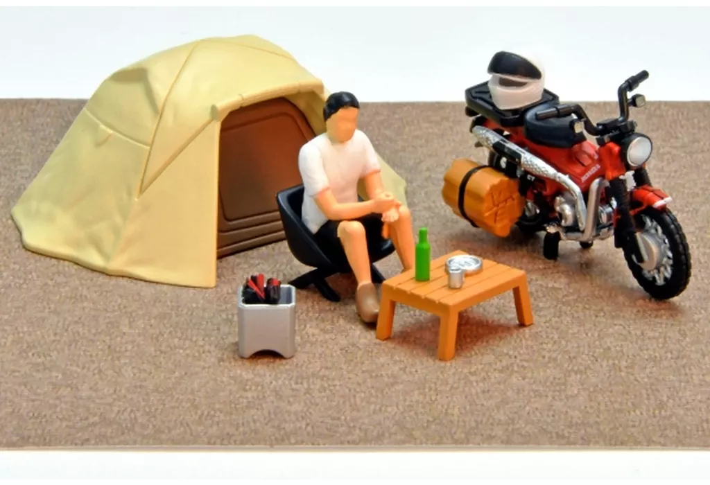 「ソロキャンプ」をテーマにしたフィギュア・小物のセット。ソロキャンパーを中心にテントや焚火、チェア、テーブルなどが付属します。ハンターカブには鞄と薪パーツが付属し、キャンプの雰囲気がより一層高まります。お手持ちのミニカーと差し替えたり、愛車(ミニカー)の映えるシーンをお楽しみください。