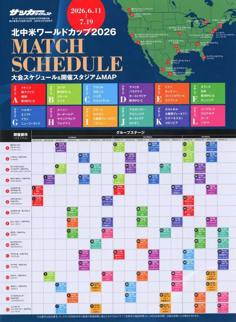 紙製品 サッカー日本代表&北中米ワールドカップ2026日程 早見シート サッカーダイジェスト 2026年2月号 別冊付録