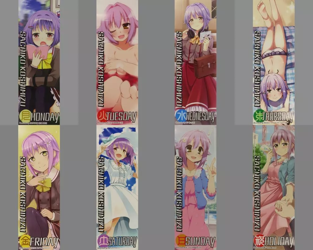 商品解説■自称・お菓子の気持ちになるですよ!にて、「自称・かな子と仁奈のオンリー準備会」より頒布のイベント企画グッズ【幸子の一週間スティックポスター8種セット】です。