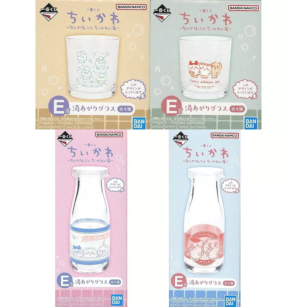 商品解説■こちらの商品は、「一番くじ ちいかわ ~なんかほっこり ちいかわの湯~」E賞景品の『湯あがりグラス』全4種セットです。【商品詳細】<セット内容>ちいかわ&ハチワレ&うさぎ(グラス)ちいかわ&ハチワレ&うさぎ&モモンガ(グラス)ちいかわ&ハチワレ&うさぎ(牛乳瓶)くりまんじゅう&シーサー(牛乳瓶)サイズ:[グラス]約8cm、[牛乳瓶]約14cm