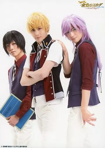 生写真(男性)/俳優 北川尚弥(芹沢睦)・碕理人(東金千秋)・上田堪大(土岐蓬生)/膝上・衣装赤.紺.白・北川左手に本・碕腕組み・体左向き・キャラクターショット・2Lサイズ/音楽劇「金色のコルダ Blue♪Sky Second Stage」ペア トレーディングブロマイド