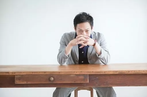 生写真(男性)/俳優 山本健史/横型・膝上・衣装グレー・黒・座り・両手組み・テーブル・背景白・ポストカードサイズ/「BSP 秋のトーク祭り!~4人のプレゼンター、4つのトークイベント+1~」くじ写真