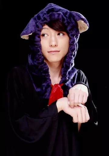 生写真(男性)/俳優 鈴木拡樹/上半身・衣装黒・紫・赤・フード耳付き・手重ね・視線左/「鈴木拡樹ファン感謝トークライブin大阪」