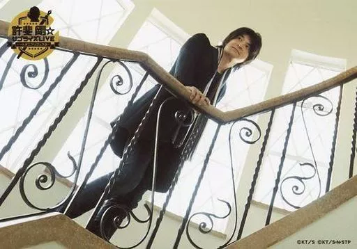 生写真(男性)/作家 許斐剛/横型・全身・衣装黒・階段・右手手すり/「許斐 剛☆サプライズLIVE ~一人テニプリフェスタ~」ハッピーメディアクリエイター時々漫画家撮り下ろしフォト