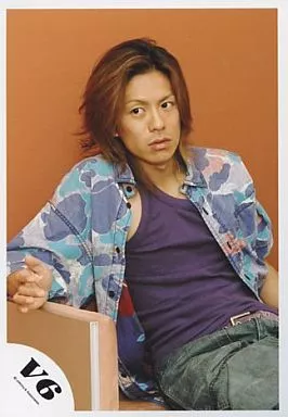 生写真(ジャニーズ)/アイドル/V6 V6/森田剛/座り・膝上・シャツ水色グレー・インナー紫・パンツカーキ色・背景オレンジ・目線左