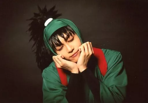 生写真(男性)/俳優 木村優良(七松小平太)/横型・上半身・衣装緑・両目閉じ・背景黒・キャラクターショット/「ミュージカル『忍たま乱太郎』第10弾再演 ~これぞ忍者の大運動会だ!~」ブロマイド