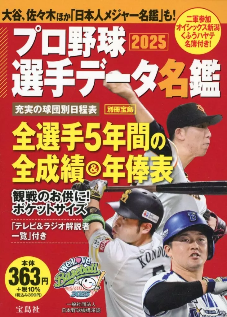 2025年プロ野球選手名鑑のポケット判。A6サイズで野球観戦のおともにぴったり。最大の特徴である全選手の過去5年間の成績&年俸を完全網羅します。また、選手だけでなく、全監督・コーチも顔写真入りで掲載。近年注目の先発投手のQS率も掲載。