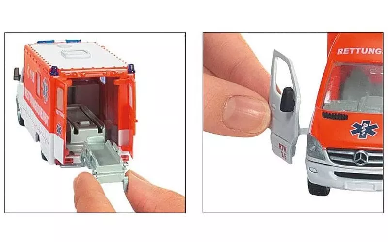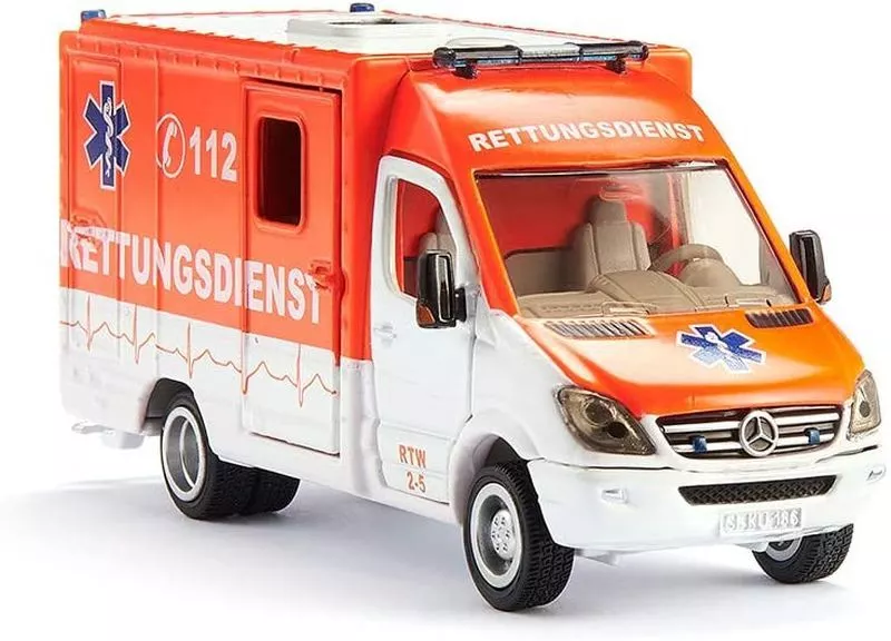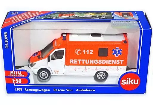 Descrição do produto ■ Rettungswagen Rescue Van Ambulance (laranja x branco) está agora disponível em um modelo de exibição em 1/50 escala.