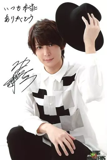 Nome do produto em japonês: 生写真(男性)/俳優 仲田博喜/膝上・座り・衣装白黒・左手上げ帽子・印刷サイン・メッセージ入り・六切りサイズ/舞台「バグバスターズ(再演)」大判ブロマイド