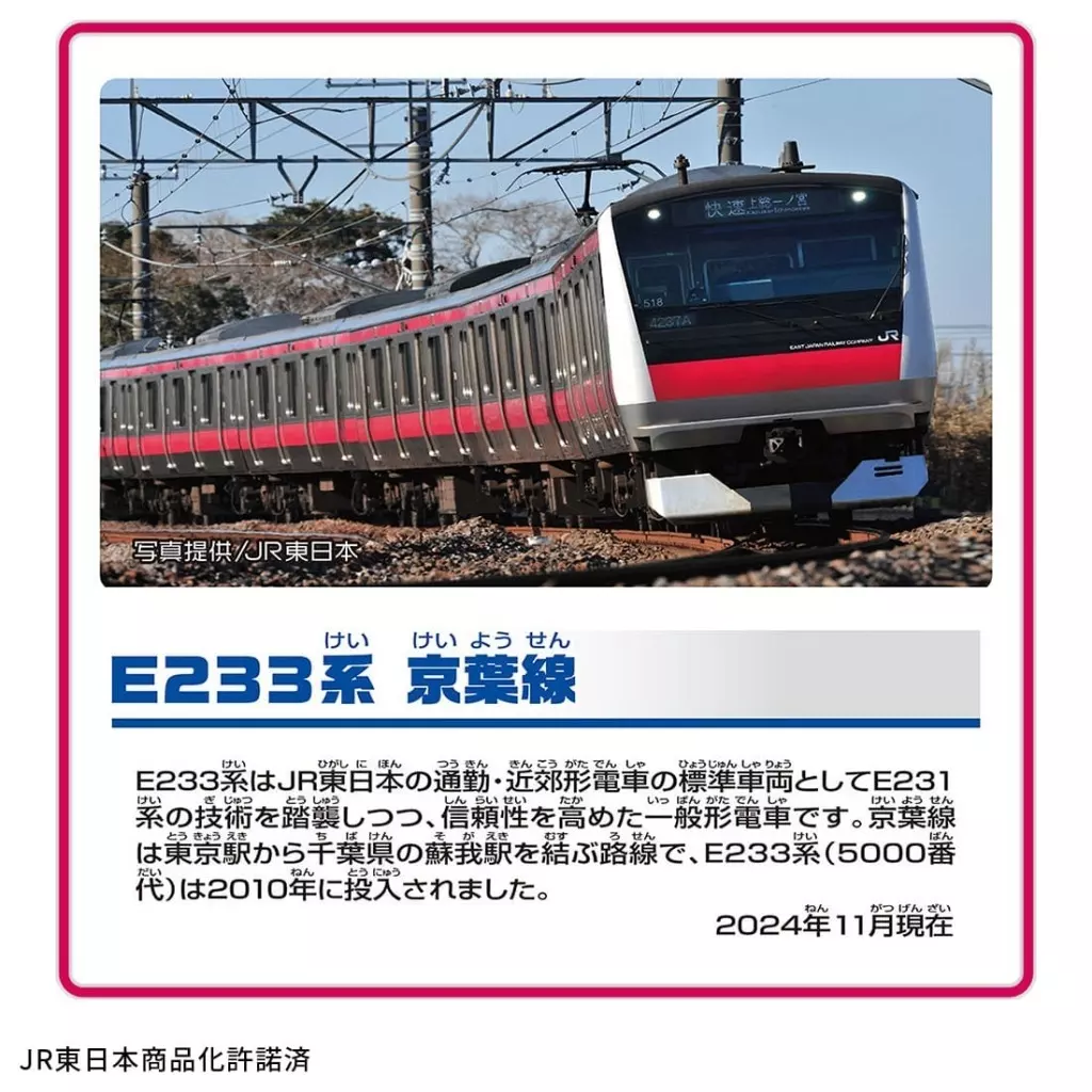 商品解说■E233系作为JR东日本的通勤、近郊型列车的标准车厢,沿袭了E231系的技术能力,同时提高了其信赖性。京叶线是连接东京千叶县的苏我站的路线,E233系是2010年投入的。・为模型・3节编成可分别连结・分离・2速电动行驶,开关OFF可手翻玩耍・附塑料列车卡※未附轨道。【商品详情车身、塑料列车卡使用电池:5号干电池×1(另售)对象年龄:3岁以上(C)TOMY JR东日本已获得商品化许可一