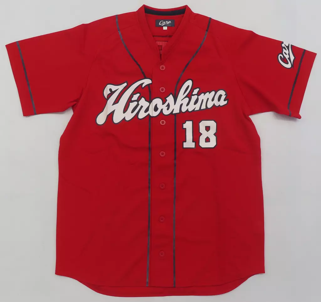 商品解说■广岛东洋鲤鱼队的前田健太(参赛编号18)的访客制服(复制品)。【商品详情】尺寸:L颜色:红色材质:聚酯100%