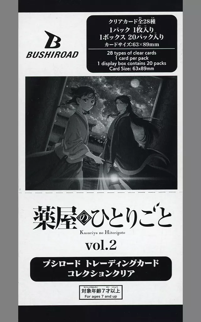 产品解说■TV动画<药店的每个人>第2期以集换式卡的形式登场!本产品全部为透明卡设计!结实且具高级感,让您享受各种装饰方式♪本产品为圆角设计。卡片尺寸:63 mm×89 mm【商品详情】1包:1片装卡片种类数(预定):共28种