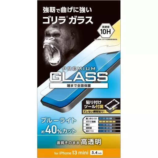 规格对应机型:iPhone 13 mini本体材质:黏着面:矽胶、外侧:玻璃、PET其他规格:Gorilla(R)玻璃、防蓝光规格配件:贴片组×1、防尘贴纸×1、清洁布×1