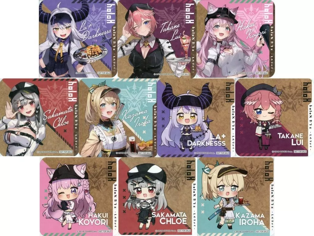 商品解说■<虚拟YouTuber Holo Live holoX咖啡-Shinrisuke-×甜点天堂>合作菜单注文特典的<原创杯垫>共10种SET。【商品详情】Laplace Darkness鹰岭路易来自博衣Ko沙花叉クロヱ风真伊露哈Laplace Darkness(Q版)鹰岭路易(Q版)博衣Ko(Q版)沙花叉クロヱ(Q版)风真伊露哈(Q版)尺寸:约9×9 cm