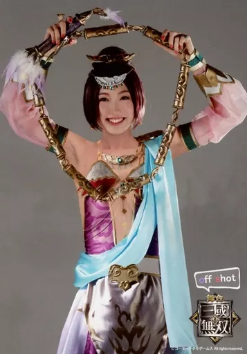 日本名: 生写真(女性)/ミュージシャン 日比美思(貂蝉)/膝上・両手武器持ち・背景グレー・笑顔・「off Shot」・キャラクターショット/舞台「真・三國無双」ランダムブロマイド