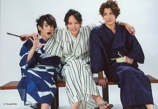 日本名: 生写真(男性)/俳優 集合(3人)/横型・膝上・座り・浴衣・センター土井・肩組み・背景白/ツキプロ文化祭「死にかけ男が転生目指して芸能界で頑張ります!~しにてん~」イベント会場限定トレーディングブロマイド