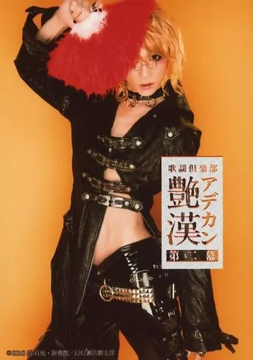 日本名: 生写真(男性)/俳優 三上俊(吉原安里)/膝上・衣装黒・右手扇子・背景黄色・キャラクターショット/「歌謡倶楽部『艶漢』第二幕」ブロマイドA