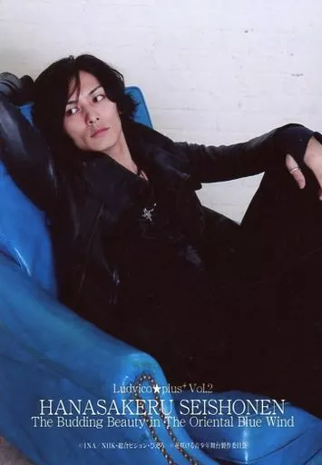 日本名: 生写真(男性)/俳優 久保田悠来(立人)/膝上・衣装黒・座り・右手上げ・目線左・ソファ青・背景白・私服ショット/ルドビコ★plus+ vol.2 異空間ステージ 花咲ける青少年 ~The Budding Beauty in The Oriental Blue Wind~