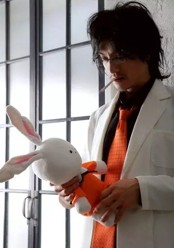 唐桥充(妮依健一)/上半身衣服黑白领带橘色双手兔子毛绒玩偶香烟视线左下方/舞台<最游记歌剧传~G.o.d Child>明信片