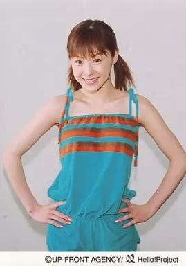 日本名: 生写真(ハロプロ)/アイドル/Hello! Project 松浦亜弥/膝上・衣装水色オレンジ・両手腰・背景白/公式生写真