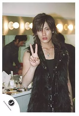日本名: 生写真(ジャニーズ)/アイドル/KAT-TUN KAT-TUN/赤西仁/上半身/背景鏡/右手ピース/黒袖無しコート
