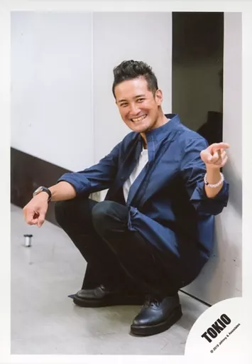 日本名: 生写真(ジャニーズ)/アイドル/TOKIO TOKIO/松岡昌宏/全身・しゃがみ・衣装黒・白・寄りかかり・左手指差し/TOKIO オフショット/公式生写真