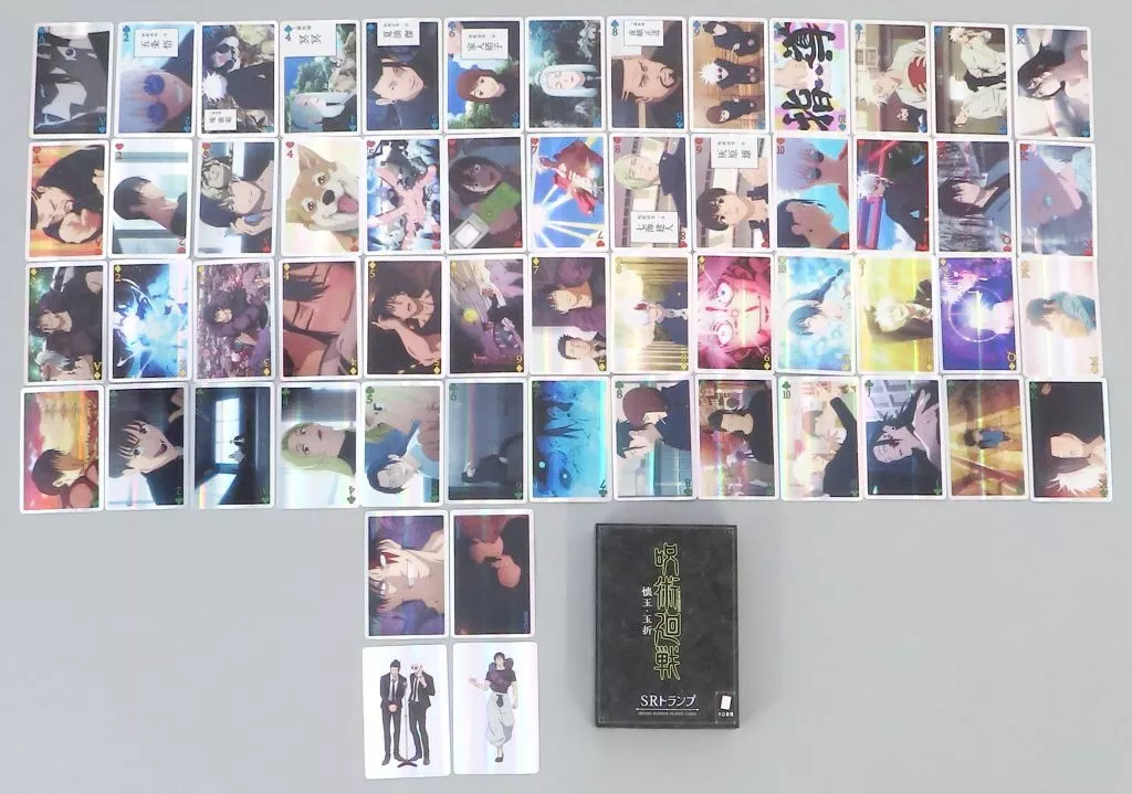 商品解說■TV動畫<咒術迴戰>是由懷玉・玉折編等各種場麵構成的撲剋牌。表麵為閃亮亮的HOLO樣式!共通一麵以黑色為基調的簡約設計,以透明的印刷(漆布)表現標題LOGO!改變光照角度,設計就會浮現!【商品詳情】撲剋牌×54、備用卡片×2適用年齡:6歲以上