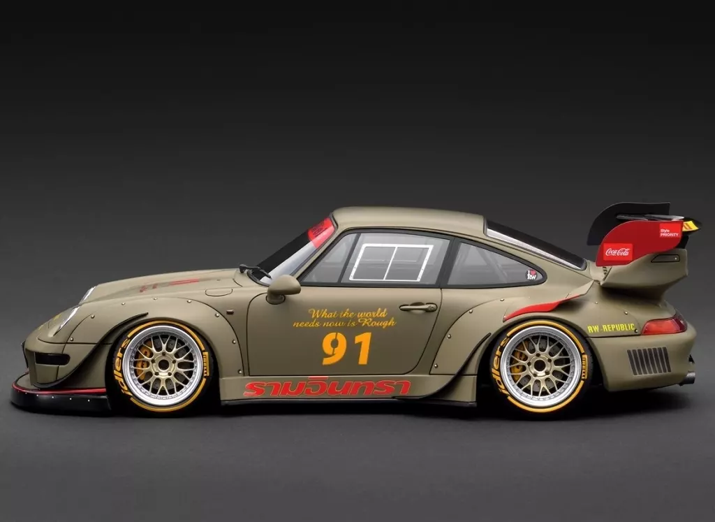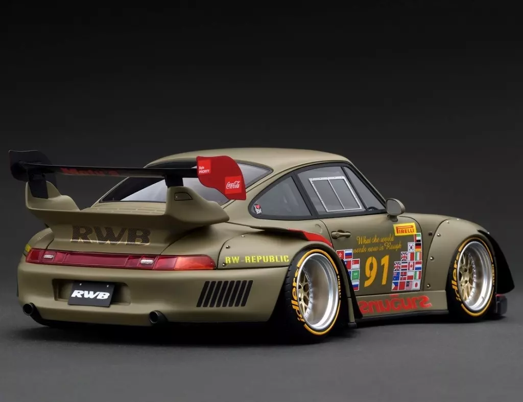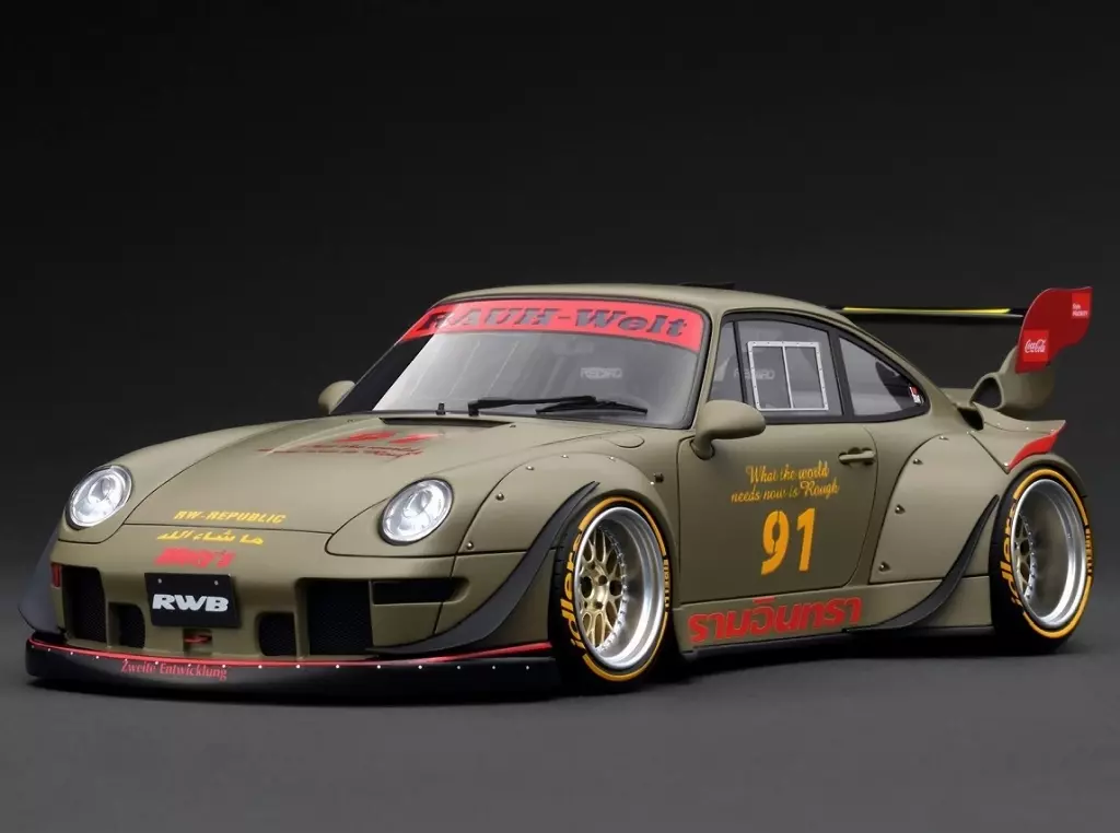 商品解說:以1/18比例的樹脂製模型再現。車身顏色:卡其色。WORK魔王再臨M1款18英寸車輪(拋光青銅&金色)搭配低矮款式。寬擋泥板、GT2款後翼、前唇擾流板、前擋泥板加卡其色、後擋泥板上部轉向器、前車窗上部RWB LOGO、左右車門號碼布&專用LOGO、桶型座席、專用方向盤、防滾架、2根排氣消音器。【商品詳情】尺寸:1/18材質:樹脂