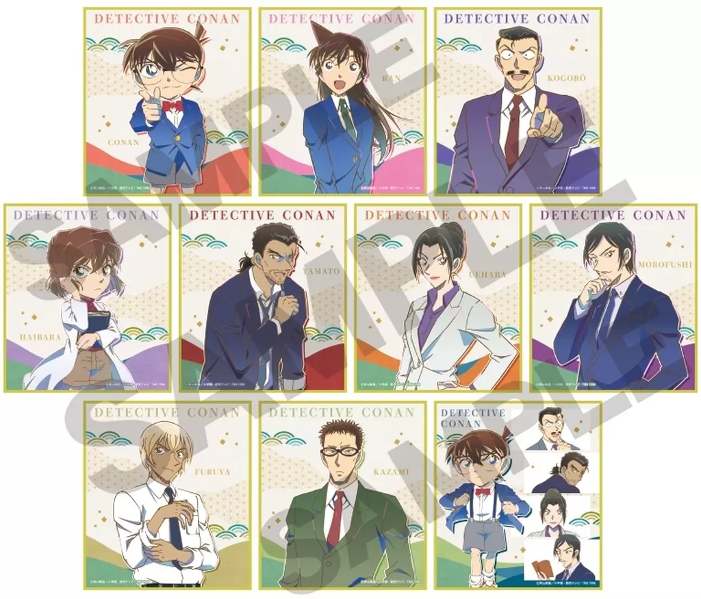 商品解說■TV動畫《名偵探柯南》的交換式迷你色紙登場!【商品詳情】共10種尺寸:約H135×W120×D2mm(C)青山剛昌/小學館・讀賣新聞TV・TMS 1996<陣容>江戶川柯南毛利蘭毛利小五郎灰原哀大和敢助上原由衣諸伏高明安室透風見裕也集合