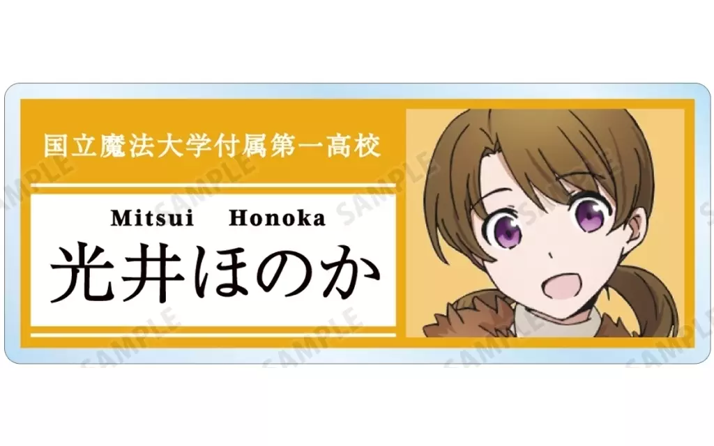將司波達也、司波深雪、安吉利娜=KUDO=SILAS、千葉Erica、西城Leonhardt、柴田美月、吉田干比古、光井HONOKA、北山雫、七草真由美、黑羽亜夜子、黑羽文彌的插圖、學校名稱結合角色色彩製作而成的壓剋力名牌。
