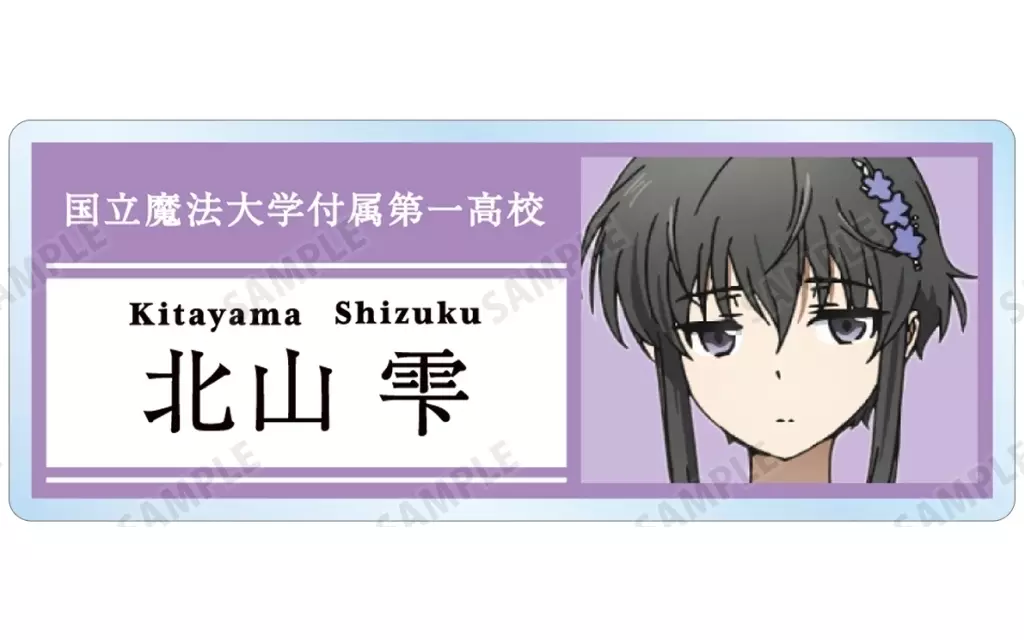 將司波達也、司波深雪、安吉利娜=KUDO=SILAS、千葉Erica、西城Leonhardt、柴田美月、吉田干比古、光井HONOKA、北山雫、七草真由美、黑羽亜夜子、黑羽文彌的插圖、學校名稱結合角色色彩製作而成的壓剋力名牌。