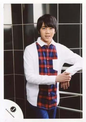 日本名: 生写真(ジャニーズ)/アイドル/Classmate J Classmate J/佐々木大光/上半身・衣装白・赤・青・チェック柄・左腕手すり・両手重ね・背景黒/ジャニーズJr.「ジャニーズ銀座2016」inシアタークリエ グッズ撮影オフショット/公式生写真