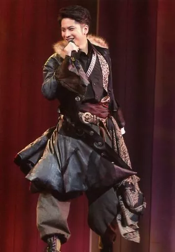 日本名: 生写真(男性)/俳優 滝口幸広/ライブフォト・全身・衣装黒・茶色・右手マイク・目線左・背景赤/舞台「歳末明治座る・フェア」ブロマイド
