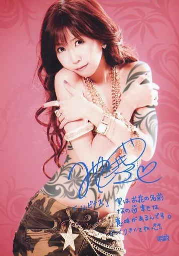 日本名: 生写真(女性)/声優 宮崎羽衣/膝上・衣装迷彩・両手肩抱き・体捻り・背景赤・印刷サイン・メッセージ入り/CD「ルピナス~幸せの風」特典生写真