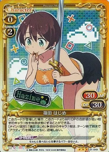 分類:角色/稀有度:R系列:NEW GAME!禮物活動商品解說"Precious Memories"是2人玩的交換卡游戲。使用收錄作品中登場的角色們的卡片,進行各種各樣的宣傳,決定游戲的勝負。另外,本卡片游戲可以混合多個作品題目玩!可以將用戶喜歡的角色、題目組合在一起組成組合板。製作眼鏡女孩組合板也好,製作泳裝組合板也好,可以根據您的喜好製作組合板!