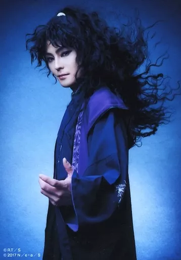 日本名: 生写真(男性)/俳優 木村了(奈落)/上半身・衣装黒・紫・左手差し出し・体左向き・背景青・キャラクターショット/舞台「犬夜叉」ブロマイド