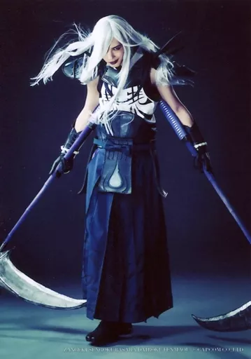 日本名: 生写真(男性)/俳優 瀬戸祐介(明智光秀)/全身・衣装白黒・両手武器・口閉じ・背景黒・キャラクターショット/斬劇『戦国BASARA』第六天魔王 生写真