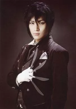 日本名: 生写真(男性)/俳優 松下優也(セバスチャン・ミカエリス)/上半身・衣装黒・白・右手ナイフ・左向き・口閉じ・背景黒・キャラクターショット/ミュージカル「黒執事 The Most Beautiful DEATH in The World 千の魂と堕ちた死神」ブロマイド