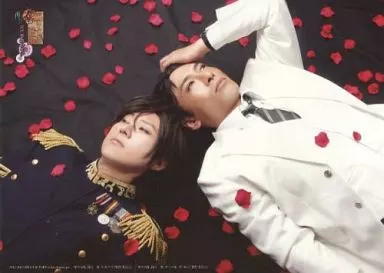 日本名: 生写真(男性)/俳優 宮内敦士(宮ノ杜正)・田坂秀樹(宮ノ杜勇)/横型・上半身・宮内衣装白・左手頭・田中衣装黒・目線左・花びら・背景黒・キャラクターショット・2Lサイズ/舞台「華ヤカ哉、我ガ一族 オペラカレイド 再会」ブロマイド