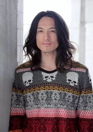 日本名: 生写真(男性)/俳優 唐橋充(鼓毒丸)/上半身・衣装黒白赤黄・両手下・体正面/舞台「極上文學 桜の森の満開の下」ブロマイド