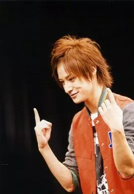 日本名: 生写真(男性)/俳優 高崎翔太/上半身・衣装オレンジ・グレー・白・両手人差し指立て・目線左下・背景黒/イベント特典生写真