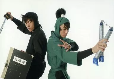 生寫真(男)/演員 前內孝文(食滿留三郎)・真佐夫(土井半助)/橫型・膝上・服裝黑・綠・刀・雙截棍・出席簿・背景白・生寫真/音樂劇「忍者亂太郎」第四彈「最恐怖查明計劃!」初演