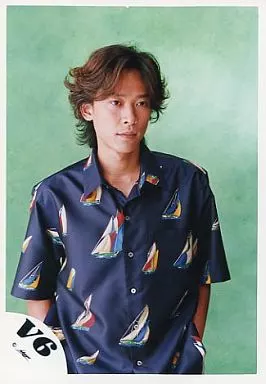 日本名: 生写真(ジャニーズ)/アイドル/V6 V6/坂本昌行/上半身・衣装紺(船の柄)・両手ポケット・目線右・背景緑/公式生写真
