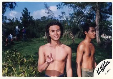 日本名: 生写真(ジャニーズ)/アイドル/Kinki Kids Kinki Kids/堂本光一・堂本剛/横型・上半身裸・光一右手ピース・剛右向き・背景木/公式生写真