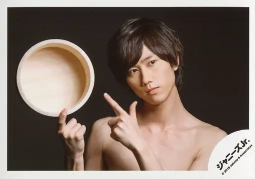 日本名: 生写真(ジャニーズ)/アイドル/Snow Man Snow Man/阿部亮平/横型・バストアップ・右手桶・左手指差し・首傾げ・目線右・背景黒/「少年たち To be!」グッズオフショット/公式生写真