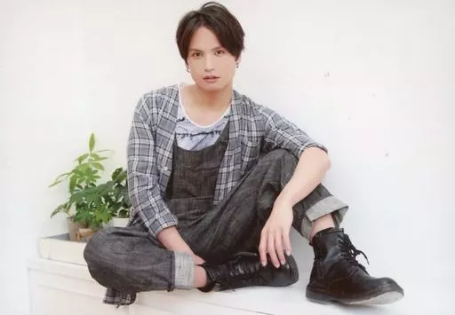 日本名: 生写真(男性)/俳優 友常勇気/横型・全身・衣装黒・グレー・チェック柄・オーバーオール・座り・左膝立て・植物・背景白/「友常勇気 Summer Event 2018 ~勇気100%~」ブロマイド