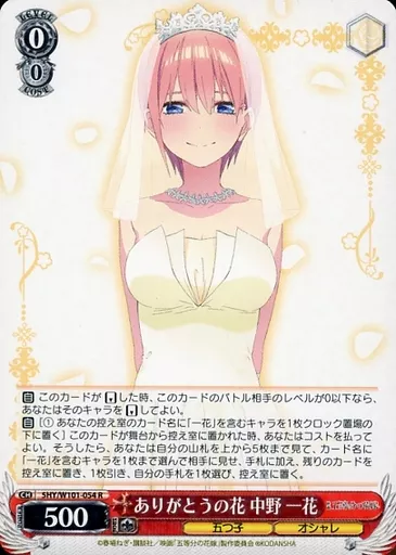 分類:角色/一分熟度:R系列:Booster Pack電影"五等分的新娘"產品解說■在Weiss Schwarz大受歡迎的標題"五等分的新娘"到電影"五等分的新娘"參戰!◇Neo Standard構築區分僅用以"5 HY/」"開頭的卡號的卡片就能組裝連廊。