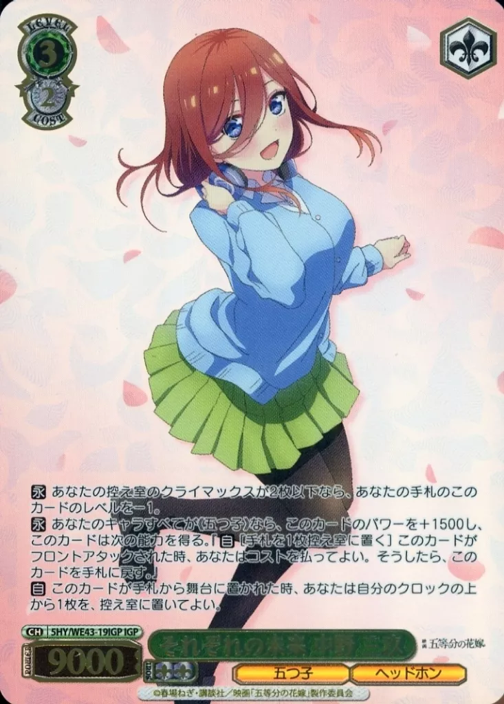 分類:角色/一分熟度:IGP系列:Premium Booster五等分的新娘∽商品解說■Weiss Schwarz推出"五等分的新娘∽」參戰!◇Neo Standard構築區分"5 HY僅用以/」開頭的卡號卡就能組裝連廊。